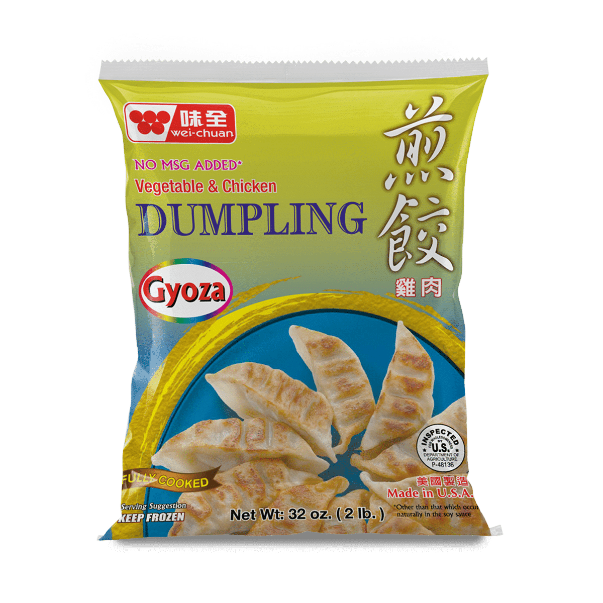Cabbage, Chicken, Soybean Oil, Less than 2% of Fried Shallot (shallot, palm oil, corn starch), Sugar, Salt, Soy Sauce (water, soybeans, wheat, salt, sodium benzoate: less than 1/10 of 1% as a preservative), Sesame Oil, Green Onion , Egg White, Tapioca Starch, Ginger, Modified Corn Starch, Black Pepper , Disodium 5’- inosinate, Disodium 5’- guanylate.